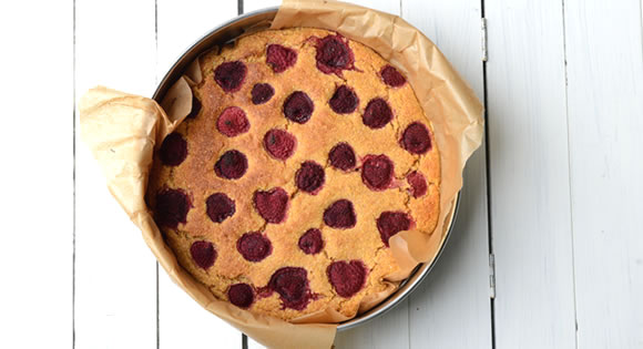 3. Pour cake batter into the prepared tin. Arrange the berries evenly over the top, then place in the oven and bake for 30-35 minutes until firm and golden. Remove cake from the oven, and allow it to stand for 5-10 minutes before turning onto a wire rack to cool.